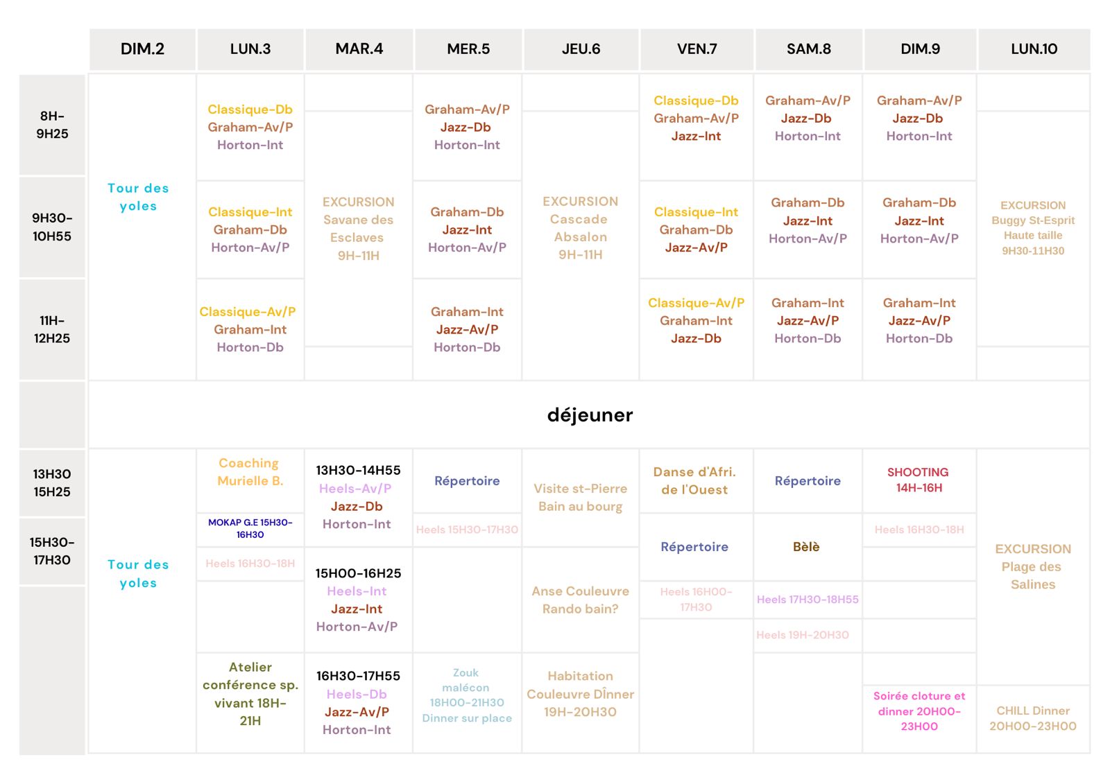 Au programme : Afro Jazz, Heels, Horton, Classique, Graham, Afro Moderne, Bèlè, Zouk, Danses d’Afrique de l’Ouest et Heels.